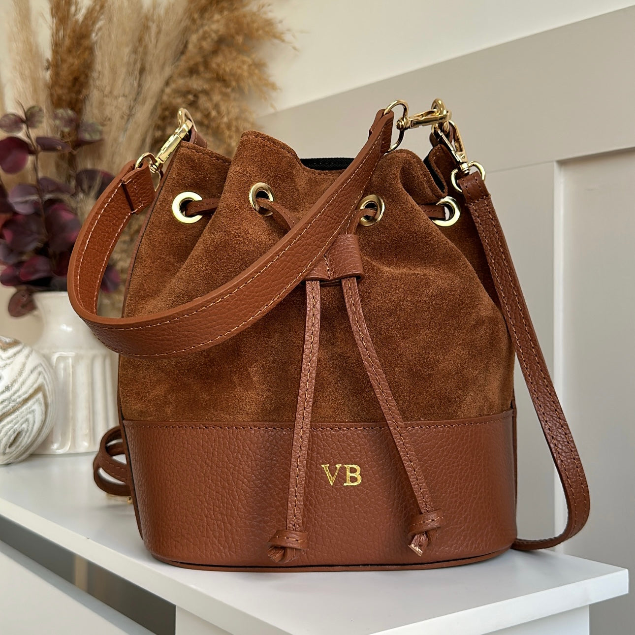 Introducing the Amara Suede Personalised Leather Bucket Bag, the must-have accessory for this season. Italian Leather and suede mix , this bag exudes sophistication and exclusivity. Its versatile bucket shape adds a touch of elegance to any outfit.